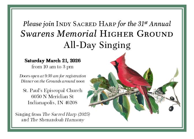 Join Indy Sacred Harp on Saturday March 21st, 2026 at St. Paul’s Episcopal Church, 6050 North Meridian Street, Indianapolis, IN 46208.